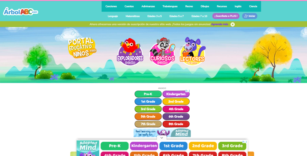 | TEMA: Plataformas de Cuentos | SUBTEMA: Pagina Arbolabc | LOGRO: los niños explorarán y participarán en los juegos educativos de la plataforma Árbol ABC, fortaleciendo habilidades básicas de aprendizaje como la lectura, el reconocimiento de letras, números y la resolución de actividades interactivas, mientras desarrollan el interés por aprender a través de herramientas digitales de forma divertida |