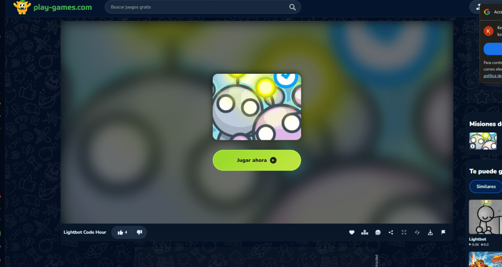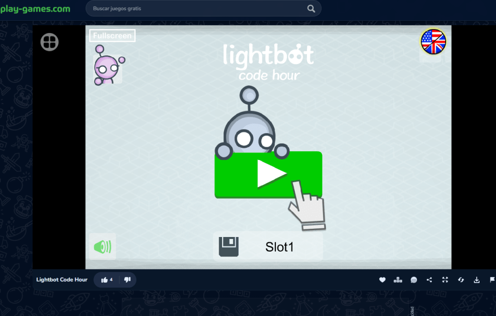 | DESARROLLO | Actividad principal: Programemos un robot La docente presenta el juego educativo: https://www.play-games.com/es/juego/40012/lightbot-code-hour.html Explicación sencilla En este juego los niños deberán programar un robot para encender luces. El robot no se mueve solo, los niños deben darle instrucciones como: avanzar girar saltar encender luz Los estudiantes deberán organizar las instrucciones en el orden correcto para que el robot llegue a su objetivo. Cada nivel se vuelve un poco más difícil, lo que permite desarrollar: pensamiento lógico resolución de problemas secuencias Actividad guiada La docente explica: Primero observamos el camino del robot. Luego pensamos qué pasos debe seguir. Arrastramos las instrucciones. Probamos si el robot llega al lugar correcto. Si el robot se equivoca, los niños deberán corregir el programa | Computador Internet Juego educativo online |